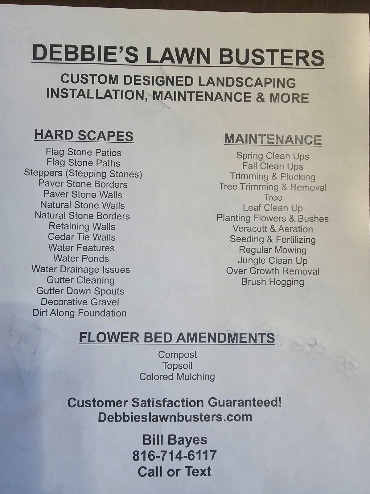 Debbies Lawn Busters would like our valued customers to go through the on-site photographs of our various landscaping projects. Please take a look and give us a call us at (816) 714-6117, if you would like Debbie's Lawn Busters to work on your next landscape project.